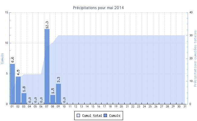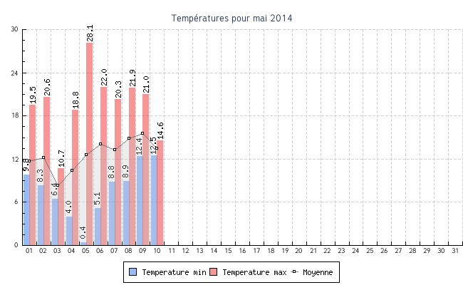 | Total | 0.4 °C | 28.1 °C | 12.7 °C | 5.1 km/h (40.3 km/h) | SSO |