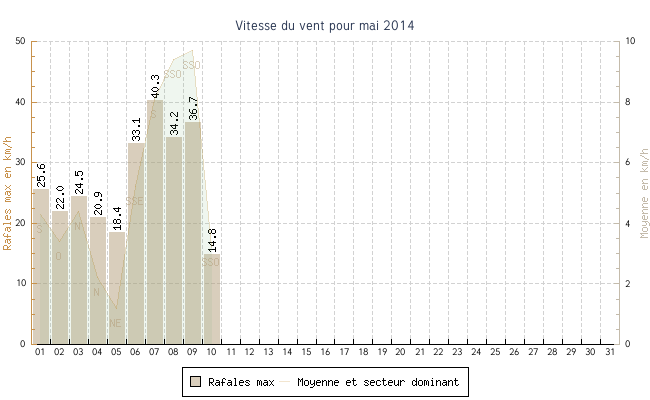 | 10 | 12.5 °C | 14.6 °C | 13.5 °C | 3.2 km/h (14.8 km/h) | SSO |